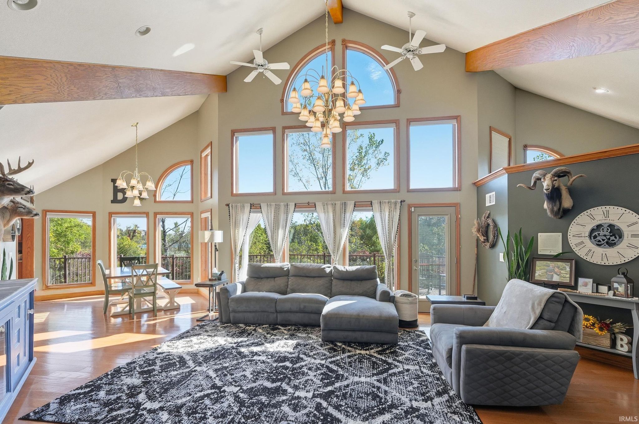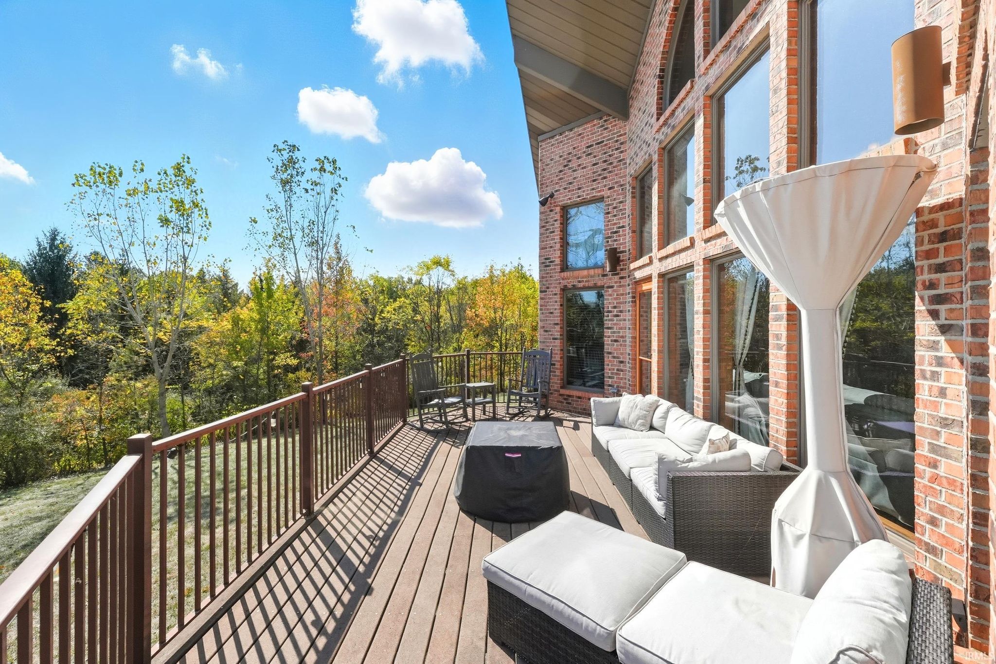 Nestled on over 5 peaceful acres, this stunning quality built Sebestyen & Williams one-story home with a walk-out basement offers the perfect blend of privacy space, and modern comfort. With 3600 square feet of finished living area, this 4 bedroom, 3.5-bath home was thoughtfully designed for convenience and flexibility-featuring two laundry rooms and two ensuite bedrooms, one on the main level and one in the basement, ideal for multi-generational living or guest accommodations. The main level boasts an inviting layout with spacious living areas, a dedicated home office, and a beautiful four seasons room overlooking the serene surroundings. The walkout basement provides additional living and entertainment space, perfect for recreation area, family room or a private retreat. Step outside and enjoy the expansive deck and large yard, perfect for outdoor dining, relaxing or hosting gatherings. A newly finished outbuilding with a mini-split system for year round comfort, offering endless options for a recreation area, bar or hobby space. Mature trees and an on-site orchard complete the peaceful, picturesque setting. Tucked away in a secluded location yet conveniently close to Taylor University, this exceptional property combines country tranquility with modern amenities, the perfect place to call home.