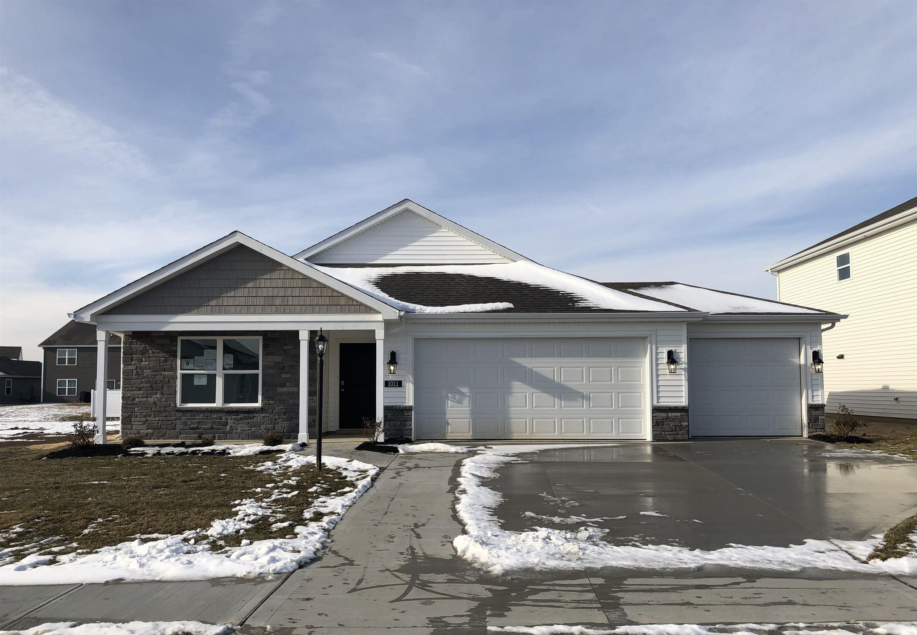 Welcome to 1011 Miller Woods Way in New Haven, IN, a stunning new home in our Riverwalk neighborhood. This single-story home sits on a spacious homesite and 3 car garage, offering a perfect balance of comfort and convenience. As you step through the front door, two secondary bedrooms and a full bathroom are tucked just off the foyer. Continue down the hallway and you’ll find the third secondary bedroom across from the laundry room. At the heart of the home, the great room, dining area, and kitchen are all connected in a spacious open-concept layout ideal for everyday living and entertaining. The kitchen is designed for both beauty and function. It features grey cabinetry, lyra quartz countertops, and stainless steel appliances. The center island includes a built-in sink and dishwasher, making meal prep and cleanup a breeze. A walk-in pantry offers plenty of storage, and the kitchen opens effortlessly to the casual dining area and great room, so you’re always part of the conversation. The private owner’s suite is located at the back of the home for added privacy. It includes a spacious bedroom, a bathroom with dual sinks, walk-in shower, and a walk-in closet. It’s the perfect retreat at the end of the day, with thoughtful features to keep mornings running smoothly. Ready to make this home yours? Schedule a tour of 1011 Miller Woods Way in Riverwalk today! Photos representative of plan only and may vary as built.